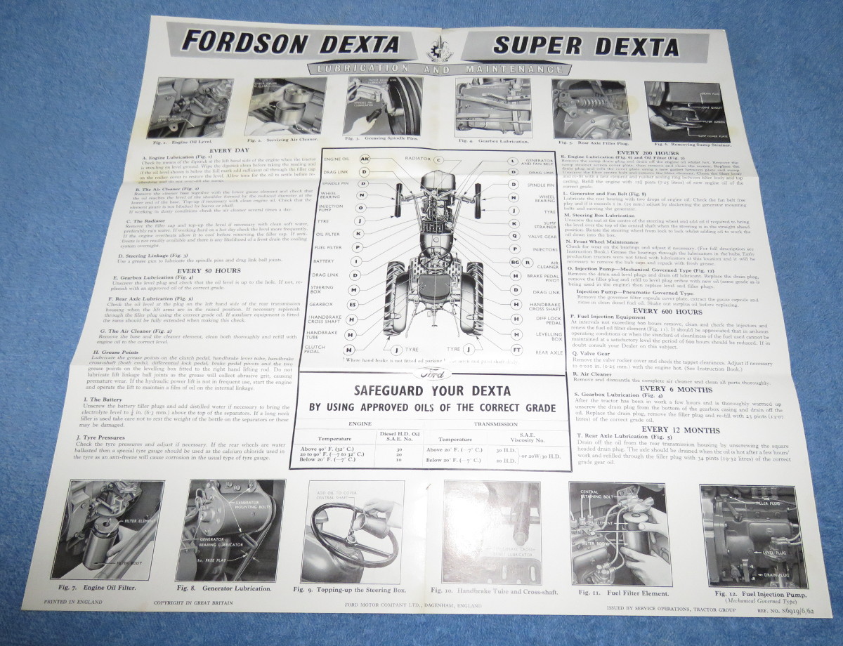 | 17513 | Ford | Fordson Dexta Super Dexta Lubrication And Maintenance | Ford | Good. The blank backside has mild staining on one panel. | 16 x 15 inch 3 fold chart with Ford Dexta & super dexta with maintenance and lubrication points illustrated. | Automotive, Agriculture, Ford, Ford Dexta | $20 |