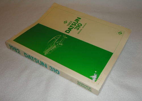 | 4152 | Nissan | 1982 Datsun 310 Service Manual | Nissan 1981 paperback with many pages and illlustrations. 8.5 by 11 inches. | Good. Shelf wear and price sticker removal mark. | 1982 Datsun 310 Service Manual | Automotive, Datsun 310, shop manual | $20 |