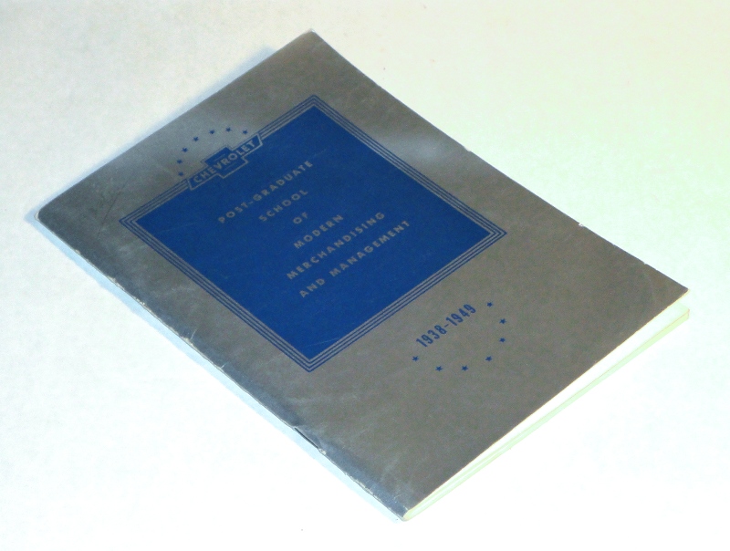 | 9043 | Anon. | Chevrolet Post-Graduate School Of Modern Merchandising And Management 1938-1949 | General Motors Chevrolet Circa 1949 stapled 5X7 booklet with stiff paper covers, 71 pages and b&w photos. | Good. Light shelf wear and creasing on the covers. | General Motors, Chevrolet , Literature | General Motors, Chevrolet , Literature, automotive, ephemera | $25 |