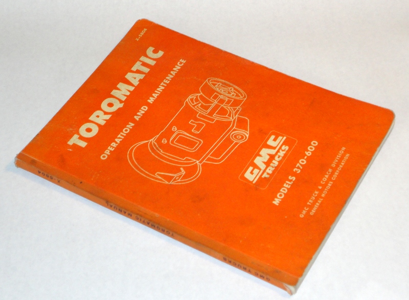 | 9697 | General Motors Staff | Maintenance Manual GMC Truck Torqmatic Transmission Models 370-600 | General Motors 1958 , 8 x 10.75 inches, with 123 pages, many photos and illustrations, and an index. | Good. Front edges of pages are grease stained. Covers have some light grease staining. Top of the spine is worn, bottom of the spine has a 1/4 inch tear. | Shop Manual, GMC Truck, Torqmatic Transmission | Shop Manual, GMC Truck, Torqmatic Transmission, automotive | $20 |