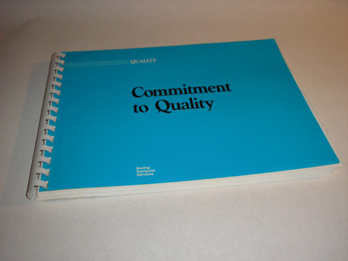 | 12012 | Boeing | Commitment to Quality | Boeing Computer Services | Good. The back cover has a 1/2 inch tear. | A Boeing Computer Services book on quality. There are some graphs and diagrams. | Aviation, Boeing, | $20 |