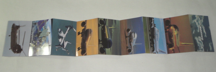 | 12166 | Boeing | Boeing | Boeing | Good. Some light creasing and shelf wear. | An 8 fold postcard shaped brochure with pictures of Boeing's aircraft on the front and their specifications on the back. | Boeing, Aviation, ephemera | $20 |