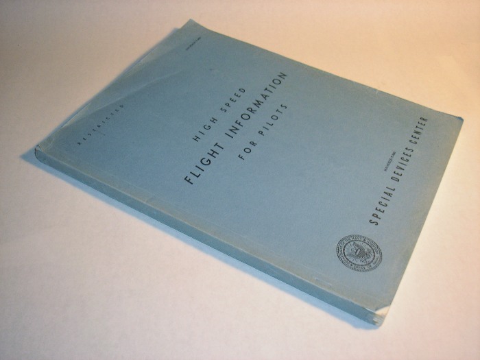 | 12473 | Special Devices Center Office Of Naval Research and Jackson & Moreland, Engineers | High Speed Flight Information For Pilots NAVEXOX P-960 | Special Devices Center Office Of Naval Research | Good. Front cover has creasing, short tears on the margins. Back cover has a vertical stain mark. Bottom of the spine missing 1/4 inch of paper. | 8.5 x 11 inch stapled paperback with many charts, diagrams, illustrations and a glossary. | Aviation, military aviation | $30 |