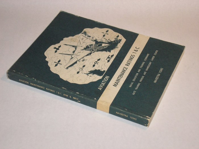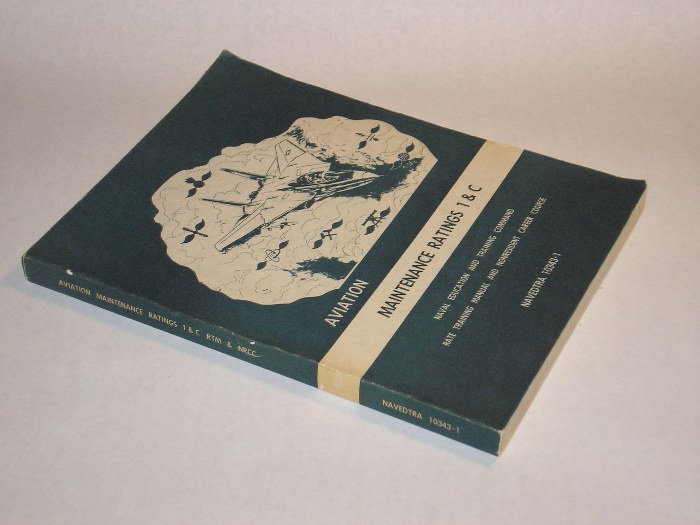 | 12751 | Naval Education and Training Command | Aviation Maintenance Ratings 1 & C | Naval Education and Training Command | Good. Light wear, creasing on the cover edges. | 8.25 x 10.75 inches with many charts and tables. NAVEDTRA 10343-1, United States Navy training manual. | USN, United States Navy, Aviation | $25 |