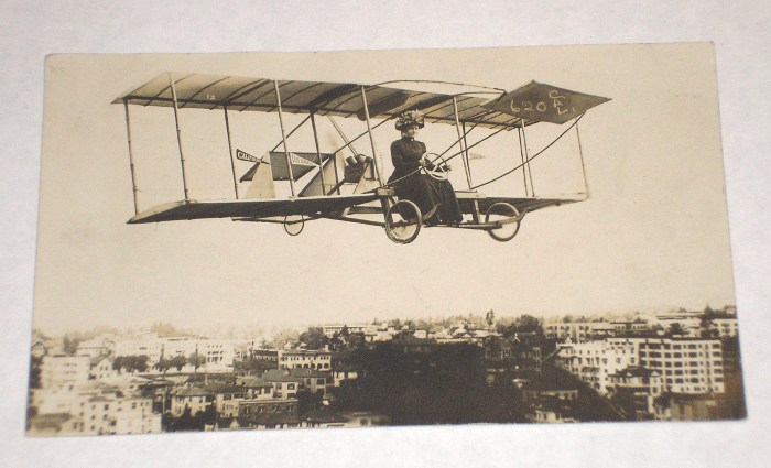 | 13118 | unknown | Old Aircraft Novelty Post Card | unknown | Good. The back is unused but a little soiled | 3.5 x 5 inches unused real picture novelty post card of a lady flying an early airplane with California and Los Angeles streamers. | Humor, Aviation, real picture post card, California | $20 |