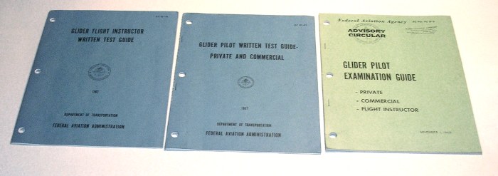 | 13128 | Federal Aviation Agency | Glider Pilot Examination Guide, Glider Pilot Written Test Guide - Private and Commercial, and Glider Pilot Flight Instructor Written Test Guide | FAA | Very good. One booklet has an ink address correction on the back | Three 8 x 10 inch glider pilot and flight instructor test guides. | Aviation, Glider | $20 |