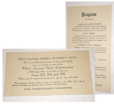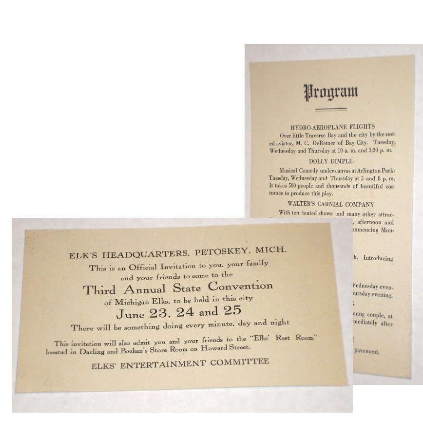 | 13141 | Petoskey, Michigan Order of Elk's | Third Annual State Convention | Petoskey, Michigan Order of Elk's | Good. Faint soiling. | 3.5 x 5.5 Official Invitation to the Third annual State Convention of Michigan Elks. The Program on the back features Hydro-Aeroplane flights by M. C. DeRemer of Bay City. (probably pioneer Michigan aviator L. H. DeRemer), a production of Dolly Dimple, Walter's Carnival Company (spelled carnial ! ) and more. | Ephemera, Petoskey, Michigan, Aviation, L. H. DeRemer, fraternal order of Elks | $40 |