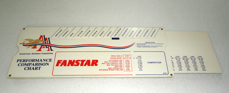 | 13819 | American Aviation Industries | Fanstar Performance Comparison Chart | American Aviation Industries | very good. | 10 x 3 7/8 inches, two sides with a sliding center. The Fanstar was a re-engined Lockheed JetStar. This sales aid has popular competetors with 9 sections on the front, five on the back including cabin layout. | Aviation, Ephemera, Fanstar | $20 |