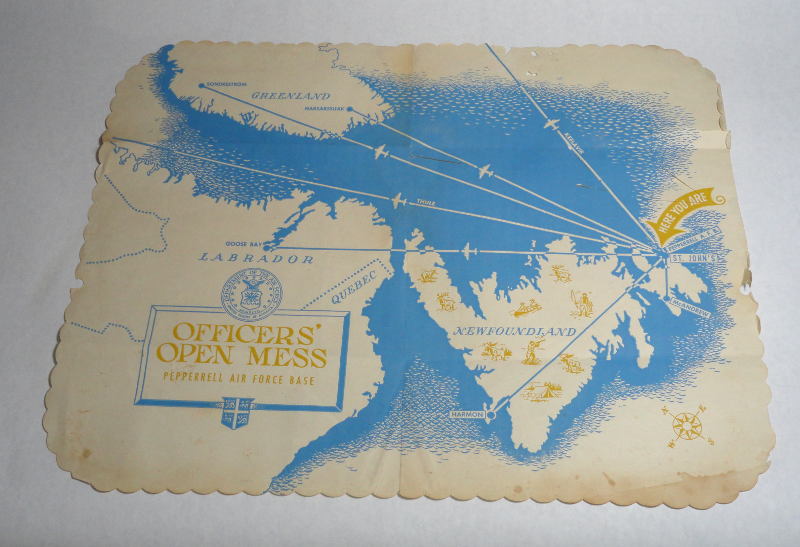 | 14679 | United States Air Forces | Officers' Open Mess Pepperrell Air Force Base Paper Place Mat | USAF | Poor to fair. Has tears, some stains and two punch marks, small holes. The remains of a scrapbook page on the back | Officers' Open Mess Pepperrell Air Force Base Paper Place Mat, St. John's, Newfoundland, Canada. 16.5 x 13 inches. | Pepperrell Air Force Base, St. John's, Newfoundland, Canada, aviation | $20 |