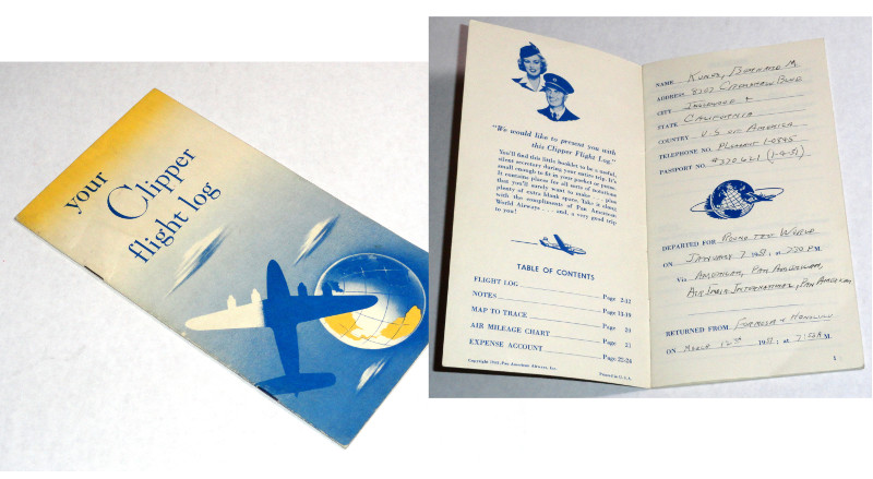 | 15197 | Pan American World Airways | Your Clipper Flight Log | Pan American World Airways | Good. Light shelf wear. | 4.25 x 8 inches, the record of a Round The World flight in 1951 by Bernard M. Kunes. Left from Inglewood California on January the 7th and returned from Formosa and Hawaii on March 12th. Approximately 24 flights. All are mentioned with aircraft involved and weather. | Aviation, ephemera, Boeing Stratocruiser, Pan American Airways, PAA | $45 |
