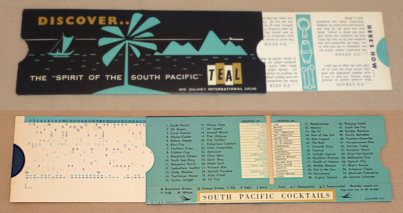 | 15765 | Teal Airlines | Discover The 'Spirit Of The South Pacific' Teal | Teal Airlines | Very good. | 8 x 3 inch "South Pacific Cocktails" calculator. | Aviation, Teal Airlines, Air New Zealand, ephemera | $20 |