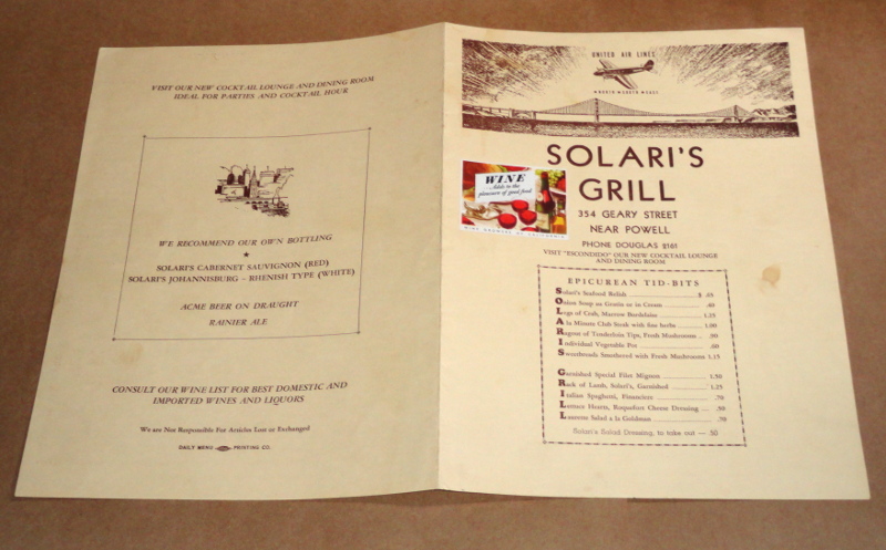 | 16021 | Solari's Grill | Solari's Grill, San Francisco, California, Menu from August 27, 1940 | Solari's Grill | Good. One small stain on the front cover. | 8 x 11 inches, an added "Wine Growers of California" sticker on the front. A stylized sketch of a United Airlines Boeing 247 over the Golden Gate bridge is at the top of the menu. Garnished Special Filet Mignon is $1.50 | Solari's Grill, San Francisco, California, restaurant menu, ephemera, aviation, Boeing | $30 |