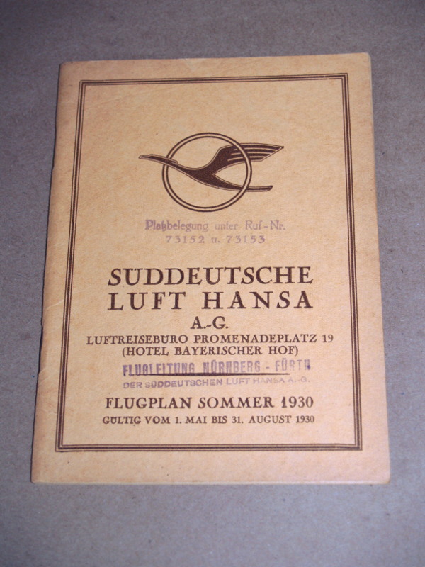| 17064 | Staff | Suddeutsche luft Hansa Flugplan Sommer 1930 (South German Lufthansa Flight Plan Summer 1930) | Luft Hansa | Good. Two rubber stamps on the front cover | 4.5 x 6.25 inches, in German, Lufthansa flight listings along with many advertisements. | Aviation, Lufthansa, ephemera | $50 |