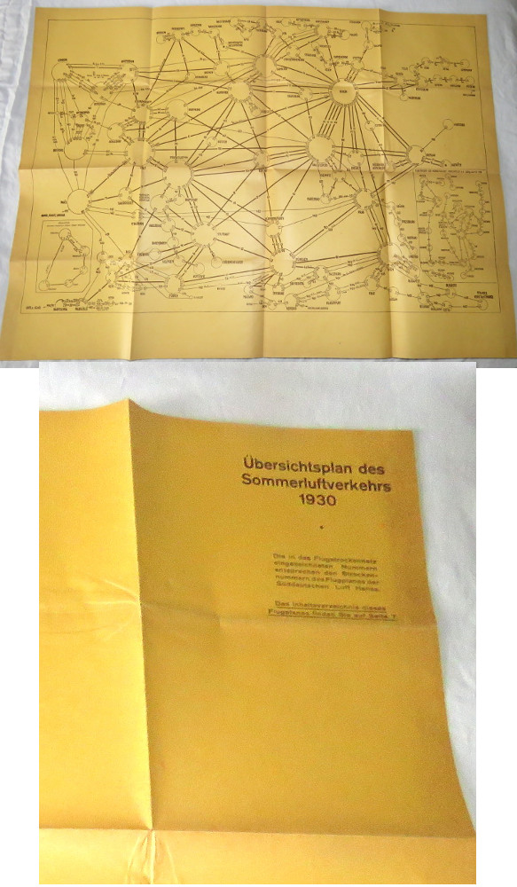 | 17191 | Luft Hansa | Ubersichtsplan des Sommerluftverkehrs 1930 | Luft Hansa | Good. Yellowing a bit. | 17 x 23 inches, 4 folds, with an air map on one side and baggage charges on the other. In German | Aviation, Luft Hansa, Ephemera, Germany | $40 |