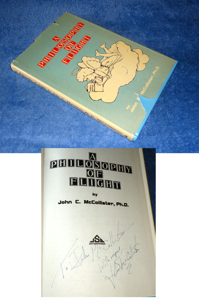 | 17378 | McCollister, John C. | A Philosophy Of Flight | JSB Enterprises | Very good. In a fair dust wrapper that has chipping and tears. | Aviation, drawings, religion, and a forward by Robert Serling. | Aviation, Religion, Philosophy | $25 |