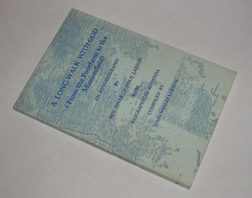 | 10413 | Larson, John Wesley | A Long Walk With God (From the Poorfarm to the Missionfield) | Self-Published | Very good. Owner's small rubber stamp inside. | 1987 paperback, signed by the author, with 140 pages and a few b&w photos. Autobiography, Larson was a missionary in Canton, China. | Autobiography, missionary, Canton, China | $20 |