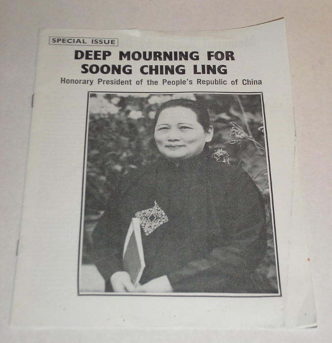 | 12660 | Women Of China Staff | Special Issue Deep Mourning For Soong Ching Ling Honorary President Of The People's Republic Of China | Women of China Magazine | Good. Light creasing and soiling. A very short tear on the top of the front cover. | 7.5 x 10 inches with b&w photos, a special issue on the death of Soong Ching Ling. | China, Soong Ching Ling, ephemera | $20 |