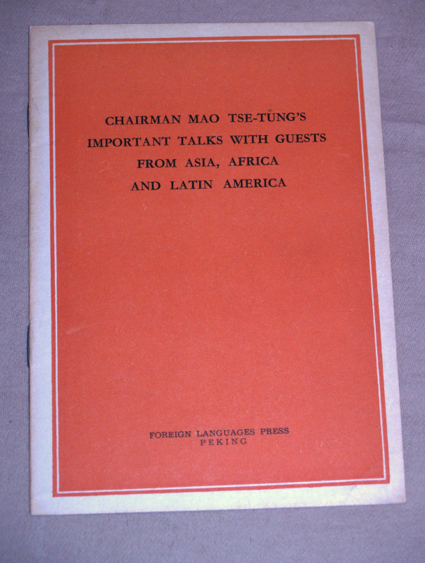 | 16836 | Chairman Mao Tse-Tung | Chairman Mao Tse-Tung's Iimportant Talks With Guests From Asia, Africa and Latin America | Foreign Languages Press | Good. Light shelf wear. | `Chairman Mao Tse-Tung | China, Chairman Mao Tse-Tung | $20 |