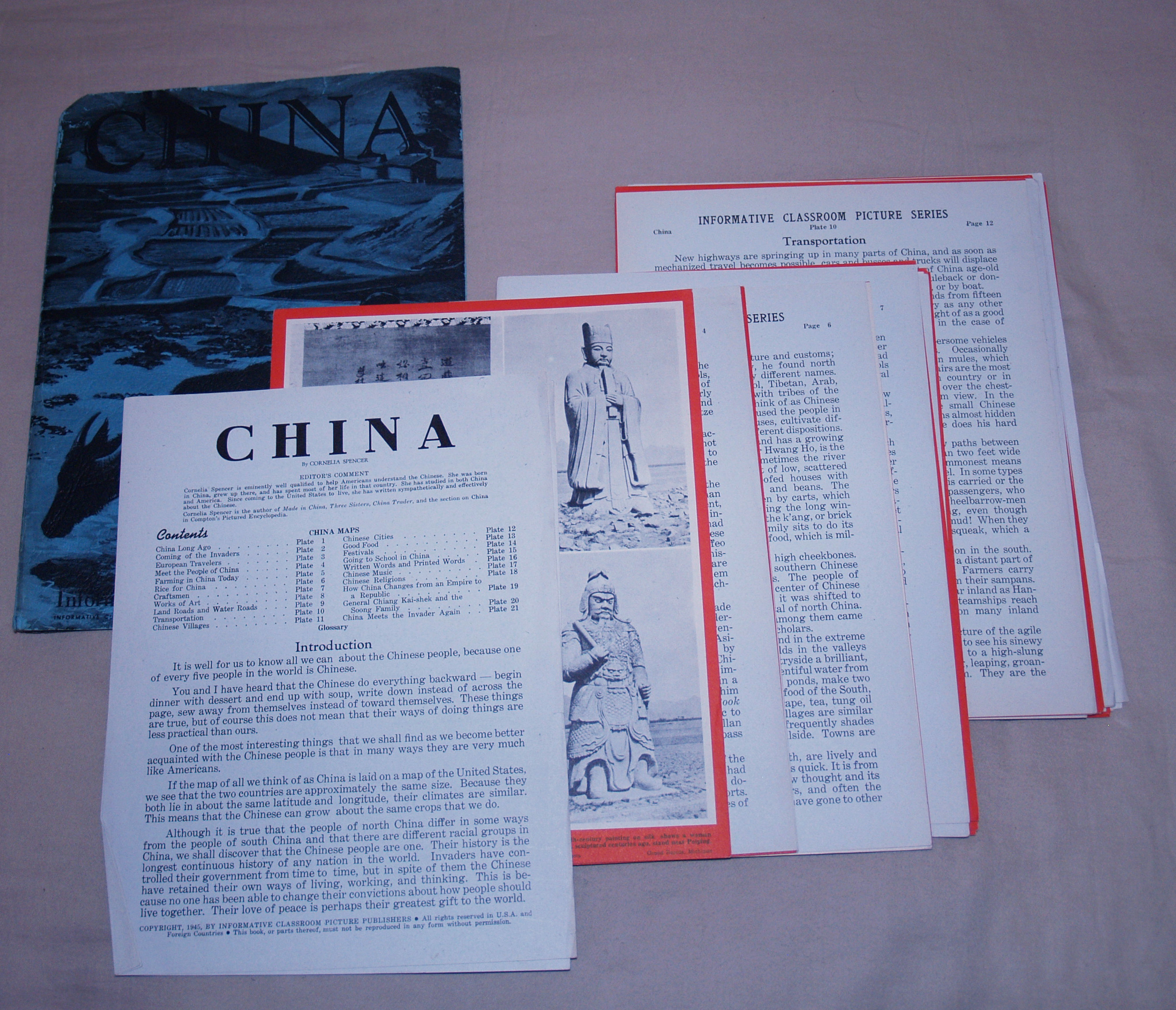 | 16844 | Spencer, Cornelia | China Informative Classroom Picture Series | Informative Classroom Picture Series | Fair to good. Missing map, cover /holder worn on top. | Informative Classroom Picture Series. 21 8.5 x 11 inch plates and their information sheets are present. The fold out map is missing. | China, history | $30 |