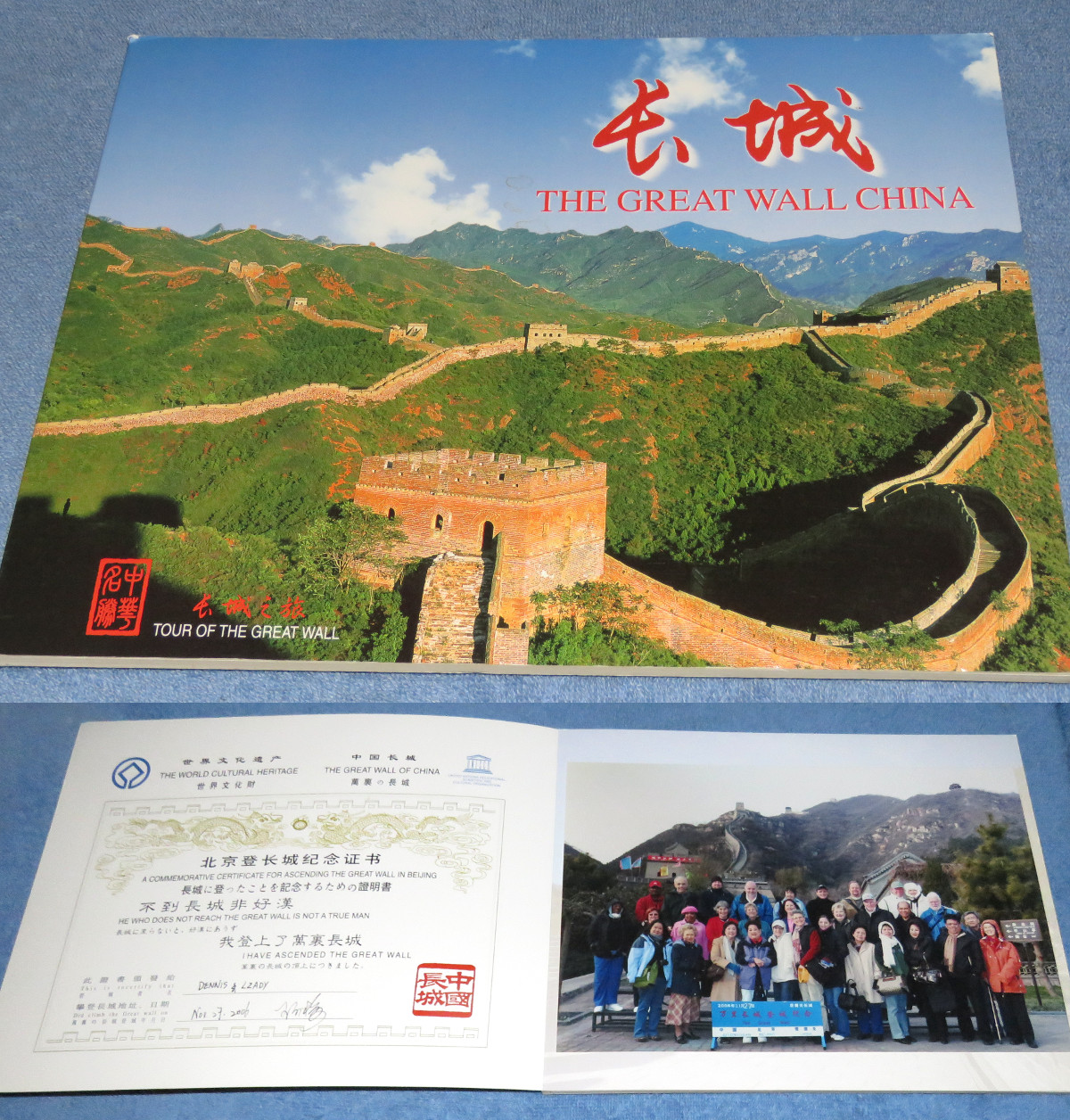 | 17566 | Anon. | A Commemorative Certificate For Ascending The Great Wall In Beijing | unknown | Very Good. | 12.5 x 10 inches with a 12 x 8 inch portrait of the group. There are many color pictures. | China, The Great Wall, travel | $25 |