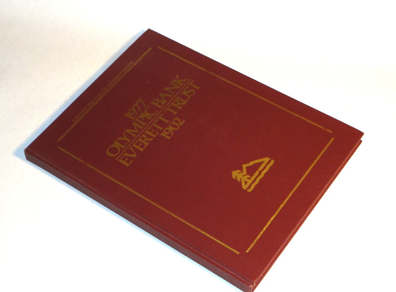 | 9129 | Branham, Mary Edith and Vera Hansberry | The First Seventy-Five Years | Olympic Bank Historical Committee 1977 8.5 x 11 inches with 105 pages, b&w photos, a fold-out of Everett banking history. | Very good with light shelf wear. No dust wrapper. | 1977 hardback, Olympic Bank Everett Trust 1902 | Pacific Northwest, Washington State, Corporate history, Olympic Bank Everett Trust | $20 |