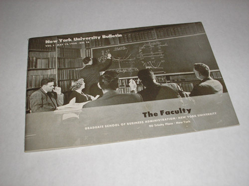 | 11775 | New York University | The Faculty Graduate School of Business Administration, New York University | New York University | Very good. Light shelf wear. | 8.25 x 5.5 inches. New York University Bulletin Vol. L, May 13, 1950 No. 24. B&w photos and biographies of faculty members | New York University, education | $20 |