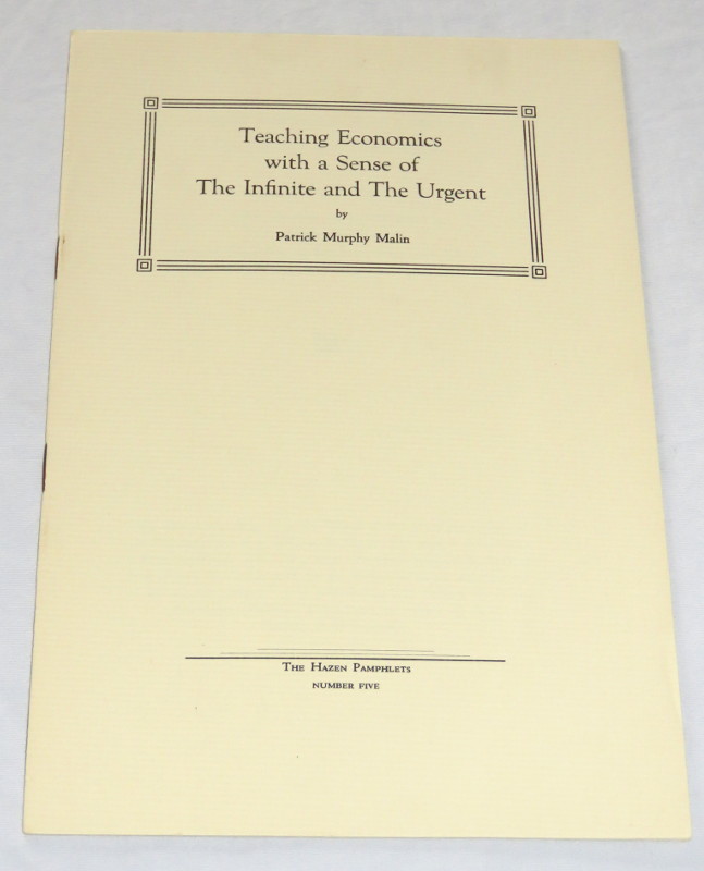 | 17160 | Malin, Patrick Murphy | Teaching Economics with a Sense of The Infinite and The Urgent | The Hazen Pamphlets | Good. | The Hazen Pamphlets Number Five | Education, economics, ACLU | $20 |