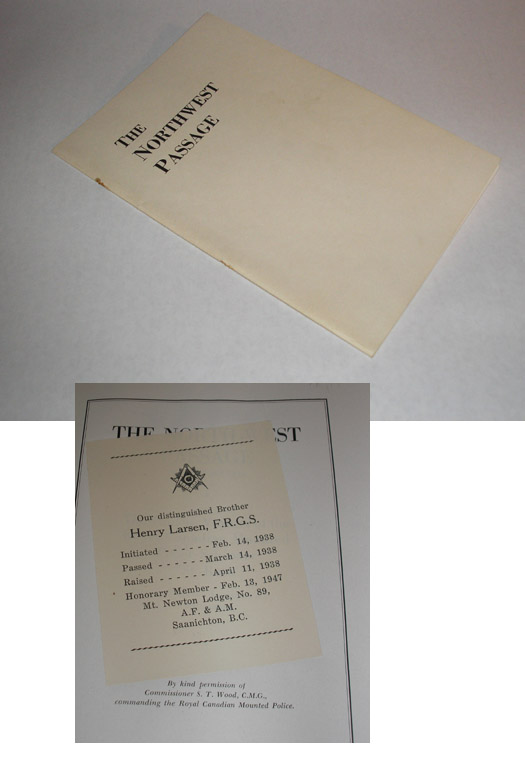 | 11117 | Larsen, Henry A | The Northwest Passage | City Archives Vancouver, Canada | Good. Light soiling on both covers and the staples are rusty. A Masonic label is pasted on the title page, covering most of the title and the author's name. | !948 stapled paperback, 6 x 9 inches, with 47 pages and b&w photos. Master of the Royal Canadian Mounted Police Schooner ST. Roch, 2nd to go through the Northwest Passage from Pacific To Atlantic. A Mason, this copy has a label pasted on the title page from the Mt. Newton Lodge, Saanichton, B.C. | Scottish Rite, Masonic, Canada, History, Freemasonry | $50 |