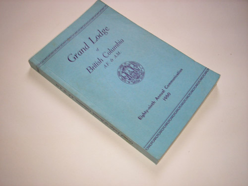 | 11333 | Morgan, John H. N., Grand Secretary | Proceedings of the Most Worshipful Grand Lodge of Ancient, Free and Accepted Masons of British Columbia at the Eighty-ninth Annual Communication held at Penticton, B.C. | Grand Lodge of British Columbia | Good. Covers and spine have some shelfwear and soiling. The bottom of the front cover has a three inch crease. Some of the pages have small creases on the bottom. There's a faint rubber stamp (from the Mount Caro Marion Lodge, A. F. & A. M. Ocean Falls, B. C.) inside. | This book has a one b&w photo of the Grand master, M. A. R. Howard, Grand Master, and many pages of tables, graphs and other information. | Mason, Masonic, Canada, Penticton, British Columbia, Freemasonry | $20 |