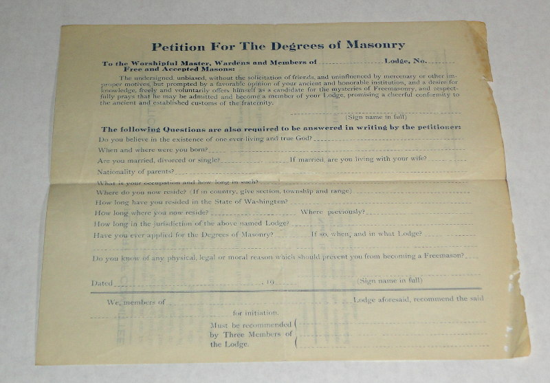 | 14257 | Masonic Lodge | Petition For The Degrees of Masonry | Masonic Lodge | Fair to good. The right side of the page is creased and has some small holes | 8.5 x 7.25 inches, a Washington State Masonic Lodge petition for the degrees of Masonry. | Masonry, Scottish Rite, Freemasonry | $20 |