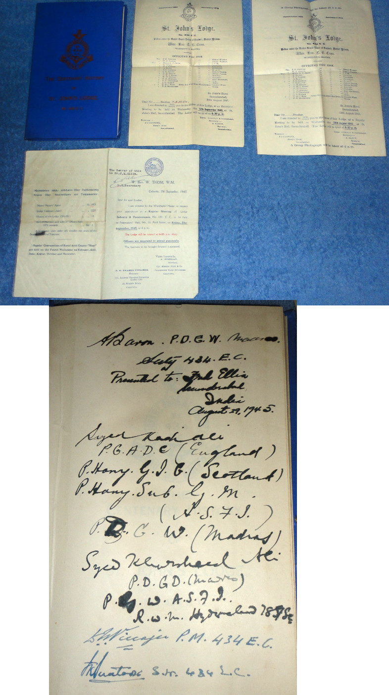 | 15912 | Smith, H. D. | The Centenary History Of St. John's Lodge No. 434 E.C. | St. John's Lodge No. 434 E. C. | Good. Light bumping on the covers. No dust wrapper. | A presentation copy to a visitor of this lodge in Madras, India, with a sort of messy ink list of signatures. Also included is a 1945 4 page bulletin with a list of members, another one page bulletin, and a 4 page invitation to the Calcutta lodge, 7th September, 1945. All items have been folded once or twice to fit the book. | Freemasonry, Madras, Calcutta, India | $150 |