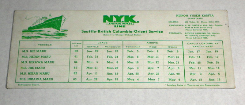 | 14336 | N.Y.K Japan Mail Line | N.Y.K Japan Mail Line, 1930's Seattle-British Columbia-Orient Service Sailing Schedule | N.Y.K Japan Mail Line | Good. | 9.25 x 4 inches with ships and sailing times on the front and an ink blotter on the back. M.S. Hie Maru, Heian Maru, Hikawa Maru. Only Hikawa Maru survived WW2. | N.Y.K, Japan, Ephemera, WW2 | $30 |