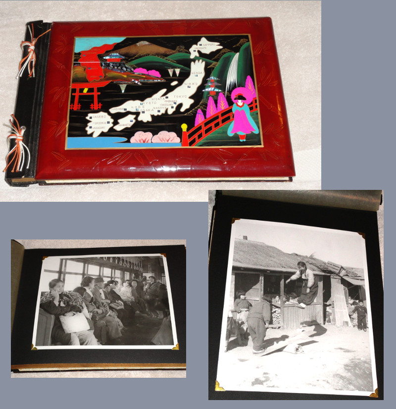 | 15236 | Unknown | Korea - Japan Photo Album 1950s | Self-published | Good. Some of the photo corners are loose, some tissue guards are creased. Others are missing parts. The front and back inside paste-downs have wrinkles. | 15.5 x 10.5 inches with an attractive, inlaid cover map of Japan and Korea, black pages with tissue guards. There are a total of ten 8 x 10 b&w photos, some mounted with photo corners. Two are duplicates. One photo of Mt. Fuji, a farming scene, cute girls on an improvised teeter totter, the San Francisco Beer Hall, Korean version. Kimpo Airfiend is mentioned on the back of a picture. | Japan, Korea, Kimpo Airfield | $75 |