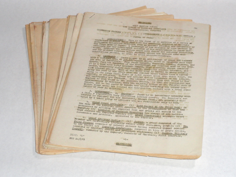 | 15596 | Army Service Corps The School of Military Government | Restricted. A 36 section course on a proposed problem, the occupation of Japan. One section missing. | Army Service Corps | Fair. A bit musty. Paper browning and occasionaly brittle. Occasional rusty staples. Some pencil writing. | 8.5 x 11 printed on one side, individual sheets. A restricted Army Service Forces course at The School of Military Government, Charlottesville, Virginia in 1944. There are 36 sections listed with number 23 missing. The subject is a hypothetical occupation of Japan in great detail. The page count is approximate. | Japan, WW2, Army Service Forces | $100 |