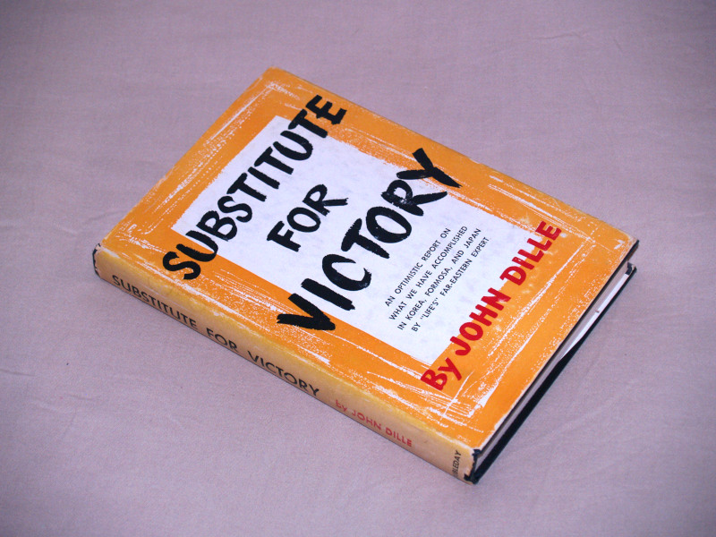 | 16767 | Dille, John | Substitute For Victory | Doubleday & Company | Good. In a good dust wrapper that shows edge wear and has an inked out price. An ugly bookplate. | "An optimistic report on What we have accomplished in Korea, Formosa, and Japan..." | Korea, Formosa, Taiwan, Japan | $25 |