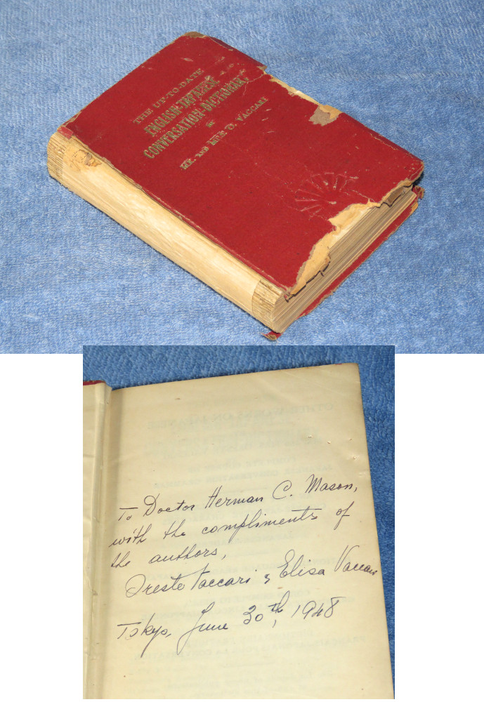 | 17142 | Vaccari, Oreste and Mrs Enko Elisa Vaccari | The Up-To-Date english-Japanese Conversation-Dictionary | Self-Published? | Fair. Spine missing, covers worn and chipped. Some small puncture holes in the pages. Binding a little loose, browning paper. | Inscribed to a doctor and signed by the authors."...with the compliments of the authors, Tokyo, June 30th, 1948. There ads in the back. | Japan, Dictionary | $75 |