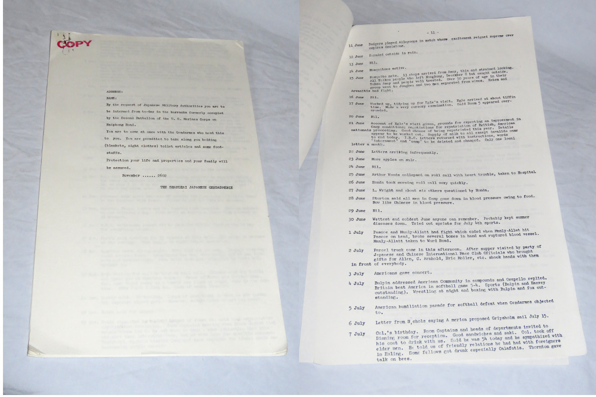 | 17273 | Unknown British | Haiphong Road Internee Diary, WW2 Japanese Camp in Shanghi | Self published | Good. The reproduction of some pages isn't always good. | 8.5 x 14 inches, "COPY", an unattributed diary (I think British, armistice day instead of VA, tiffin for food) of 16 pages. Starts at November 5, 1942, ends September 13, 1943. A daily typewritten record. Food, discipline, deaths, sickness and more and the Haiphong Road Camp. | Japanese Kempeitai, Shanghi, WW2, Haiphong Road Camp | $50 |