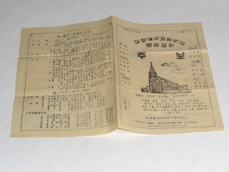 | 15580 | Anon. | Young Nak Presbyterian Church bulletin for May 5, 1954, Seoul, Korea | Young Nak Presbyterian Church, Seoul, Korea | Good. Fold marks. | 5.25 x 7.75 inches, in Korean, with 4 pages, a church bulletin | Korea, Presbyterian, ephemera | $20 |