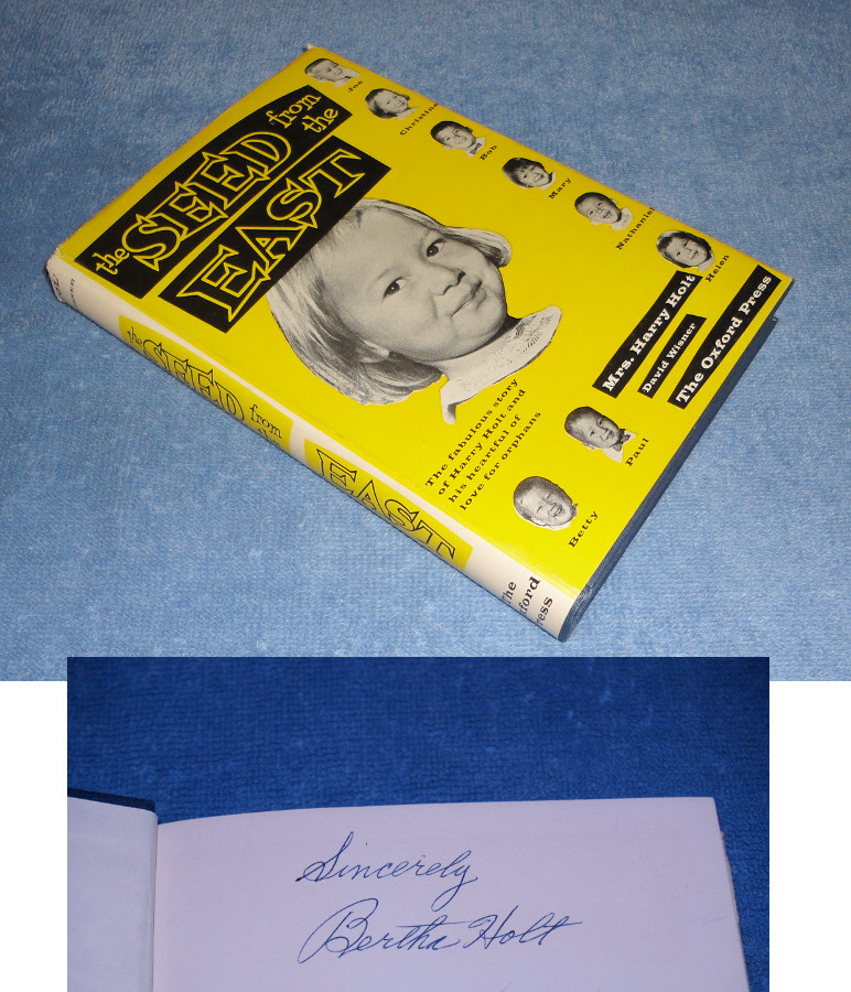 | 17342 | Holt, Mrs. Harry | The Seed From the East | The Oxford Press | Good. In a lightly worn dust wrapper. | Korean adoptions. There are b&w photos. Signed "Sincerely Bertha Holt." Korean war orphans. | Holt International, adoptiion, Korea, Korean War Orphans. | $50 |