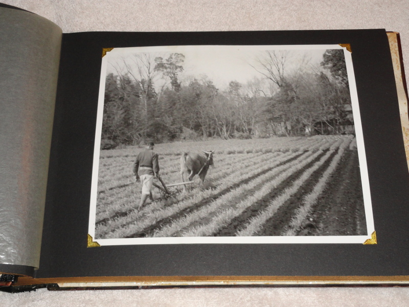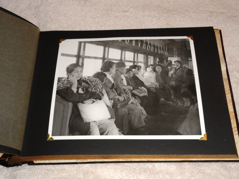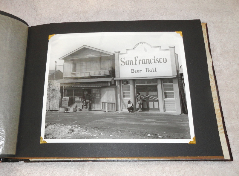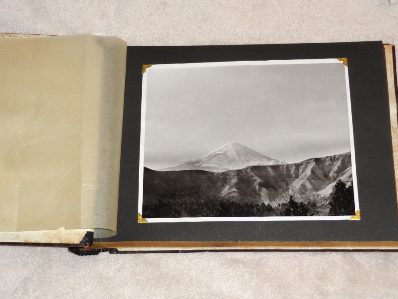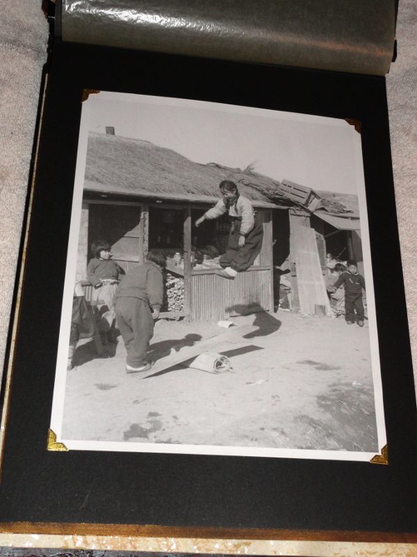 15.5 x 10.5 inches, black pages with tissue guards. There are a total of ten 8 x 10 inch b&w photos, some mounted with photo corners. Two are duplicates. One photo is of Mt. Fuji, there's a picture of the inside of a bus or street car, a farming scene, a delightful picture of two girls with an improvised teeter totter, one of the "San Francisco Beer Hall (in Korea) " and a harbor scene in Stockton, CA.
