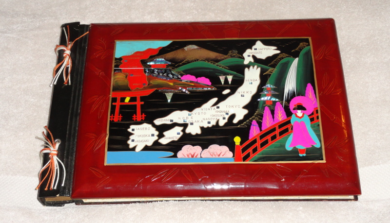 | 15236 | Unknown | Korea - Japan Photo Album 1950s | Self-published | Good. Some of the photo corners are loose, some tissue guards are creased. Others are missing parts. The front and back inside paste-downs have wrinkles. | 15.5 x 10.5 inches with an attractive, inlaid cover map of Japan and Korea, black pages with tissue guards. There are a total of ten 8 x 10 b&w photos, some mounted with photo corners. Two are duplicates. One photo of Mt. Fuji, a farming scene, cute girls on an improvised teeter totter, the San Francisco Beer Hall, Korean version. Kimpo Airfiend is mentioned on the back of a picture. | Japan, Korea, Kimpo Airfield | $75 |