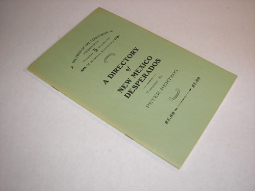 | 11613 | Hertzog, Peter | A Directory of new Mexico Desperados | The Press Of The Territorian | Good with light fading on the cover edges. | Western Americana, an alphabetical list of new mexico Desperados. Each name has a short entry on associations and sometimes dates. | Western Americana, New Mexico | $20 |