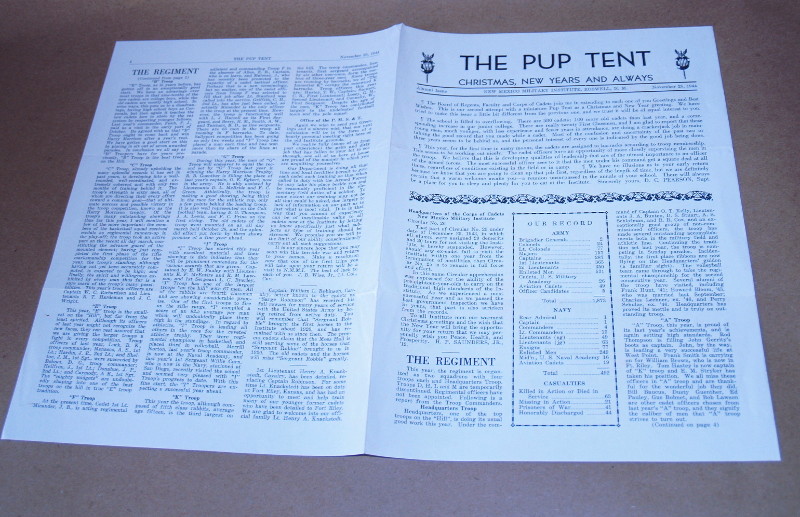 | 17058 | Pearson, D. C., Supt. | The Pup Tent, November 25, 1944 | New Mexico Military Institute, Roswell, N. M. | Good. Fold creases. | 8 x 11 inches, Alumni Issue with a list of 'killed in action', 'citations' and more. | WW2, New Mexico Military Institute, Roswell | $30 |