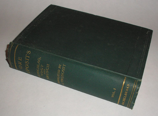 | 10555 | Beyschlag, Prof. Dr. F., Prof. J. H. L. Voght and Prof. Dr. P. Krusch | The Deposits of the Useful Minerals & Rocks Their Origin, Form, and Content Vol. I Ore-Deposits in General-Magmatic Segregations Contact-Deposits-Tin Lodes-Quicksilver Lodes | Macmillan and Co. | Fair to good. Covers and spine have some shelf wear and soiling. Previous owner's rubber stamp 3 times inside. Owner's name in ink inside. Back hinge has cracking, has been re-glued. Front edge of the pages have a light moisture stain. Top edge of pages is gilt. No dust wrapper. | 1914 hardback with 514 pages, maps, drawings, photos and an index. | Geology, minerals, mining | $50 |