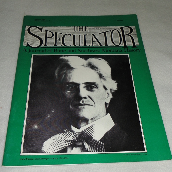 | 12306 | Shovers, Brian, co-editor | The Speculator A journal of Butte and Southwest Montana History Summer 1985 Volume 2, Number 2 | Butte Historical Society | Good. Light shelf wear on the covers. There's a brown paper stain? mark inside the front cover. | 8.5 x 11 inches, this edition is about socialism in Butte, Montana, particularly the reign of Socialist Mayor Lewis Duncan in 1911, his influence on the town and mining. There are nice b&w photos. | Montana, Socialism, Mining, Lewis Duncan | $75 |