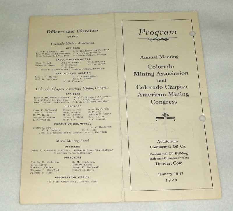 | 13593 | Colorado Mining Association | Program Colorado Mining Association Annual Meeting January 16-17, 1929 | Colorado Mining Association | Good. Some soiling and light creasing. Two paper punch marks in a margin. | 4 x 9 inches, folded once, the program for the Annual Meeting of the Colorado Mining Association and Colorado Chapter American Mining Congress. Auditorium of Continental Oil Co., Denver, Colorado, 1929. A "Sowbelly Supper" is mentioned. | Corporate history, Mining, Denver, Colorado, ephemera | $20 |