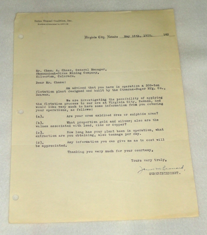 | 13594 | Leonard, James M., Superintendent | Sutro Tunnel Coalition, Inc., letter to Chas. A. Chase | Sutro Tunnel Coalition, Inc. | Good. Light shelf wear and soiling. Punched for a 3-ring binder. | 8.5 x 11 inches, superintendent Leonard asks Chase, general manager of the Shenandoah-Dives Mining Company, about the operation of a 300-ton flotation plant designed by Stearns-Roger Company. | Sutro Tunnel Coalition, Inc., Virginia City, Nevada, ephemera, mining | $25 |
