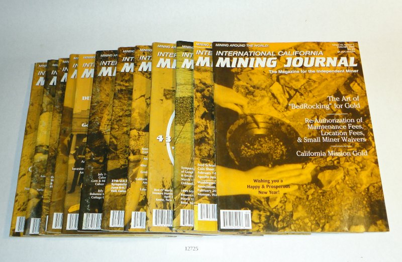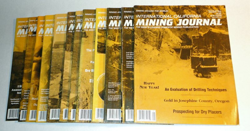 | 13724 | Harn, Kenneth L., editor | International California Mining Journal 1998 complete, 12 issues | Kenneth L. Harn | Good. Very occasional ink notes and creasing. | 8.25 x 10.75 international mining magazines with interesting articles, b&w photos and ads. Mining in Mexico, Arizona, California, Alaska, Oregon, Washington State, Nevada, Idaho and all over the world. | Mining, gold | $20 |