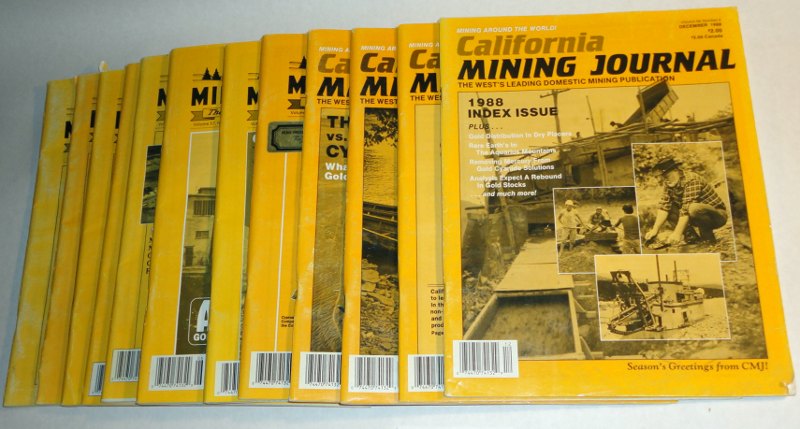 | 13726 | Harn, Kenneth L., editor | California Mining Journal 1988 complete, 12 issues | Kenneth L. Harn | Good. Very occasional ink notes and creasing. | 8.25 x 10.75 international mining magazines with interesting articles, b&w photos and ads. Mining in Mexico, Arizona, California, Alaska, Oregon, Washington State, Nevada, Idaho and all over the world. | Mining, gold | $20 |