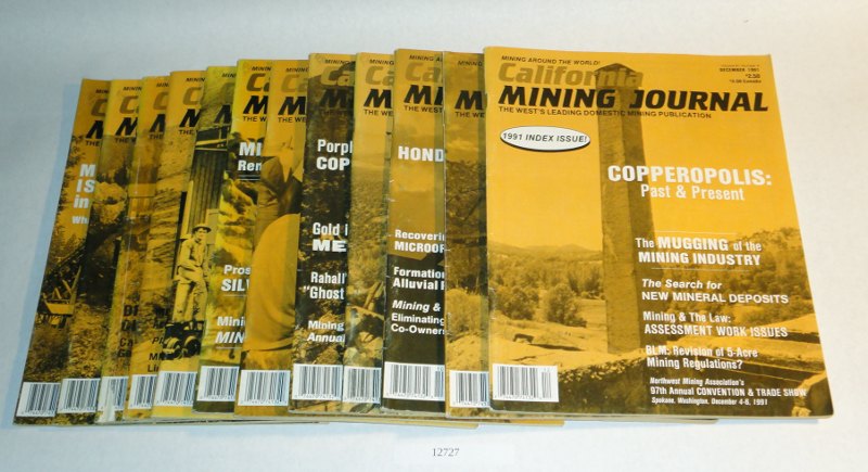 | 13727 | Harn, Kenneth L., editor | California Mining Journal 1991 complete, 12 issues | Kenneth L. Harn | Good. Very occasional ink notes and creasing. | 8.25 x 10.75 international mining magazines with interesting articles, b&w photos and ads. Mining in Mexico, Arizona, California, Alaska, Oregon, Washington State, Nevada, Idaho and all over the world. | Mining, gold | $20 |